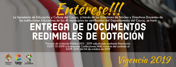 PARA: PERSONAL DOCENTE Y ADMINISTRATIVO DE INSTITUCIONES EDUCATIVAS DE LOS 41 MUNICIPIOS NO CERTIFICADOS DEL DEPARTAMENTO DEL CAUCA, BENEFICIARIOS DE DOCUMENTOS REDIMIBLES DE DOTACIÓN VIGENCIA 2019.