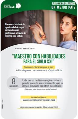 El seminario de educación para la paz busca fortalecer las competencias de los docentes en el camino hacia el postconflicto y fortalecimiento del tejido social. Los interesados podrán acceder al aula virtual inscribiéndose en www.asesoriascurriculares.com hasta el 30 de julio de 2018.