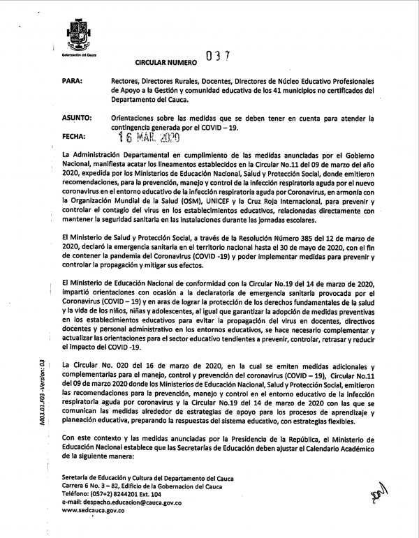 ASUNTO: Orientaciones sobre las medidas que se deben tener en cuenta para atender la contingencia generada por el COVID -19.