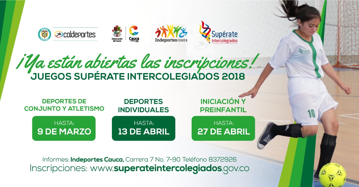 Desde el 1 de febrero se abrieron las inscripciones para la temporada 2018 del programa Supérate Intercolegiados, en los deportes de conjunto, atletismo, categorías de iniciación y pre infantil y los deportes individuales en categoría juvenil y pre juvenil.